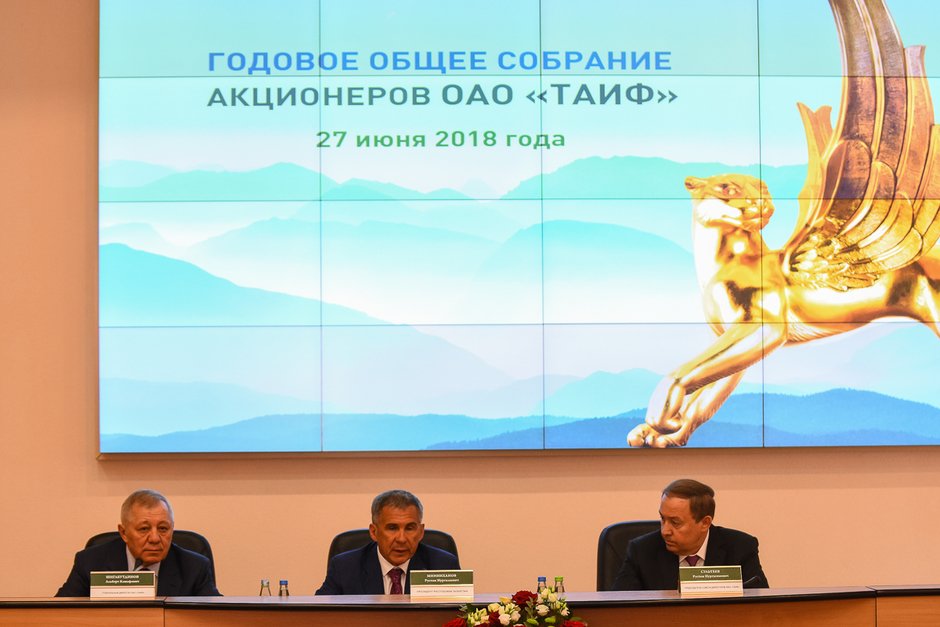На годовом собрании акционеров ОАО «ТАИФ» были подведены итоги деятельности Группы компаний ТАИФ и акционерного общества за 2017 год. В работе собрания принял участие президент Татарстана Рустам Минниханов. Выступая с докладом о результатах деятельности Группы компаний ТАИФ за 2017 год, генеральный директор ОАО «ТАИФ» Альберт Шигабутдинов отметил, что, несмотря на то, что год был непростым, результаты работы ведущих нефтехимических предприятий — ПАО «Нижнекамскнефтехим» и ПАО «Казаньоргсинтез», а также энергетической компании ОАО «ТГК-16», входящих в Группу ТАИФ, по физическим объемам производства товарной продукции были самыми рекордными за все время их деятельности.
