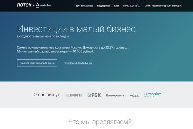 Краудлендинг — система кредитования, при которой крупные компании или физлица могут кредитовать малый бизнес с относительно небольшими рисками через Сеть. Воплощением этой системы в России и является интернет-проект «Поток», родившийся в стенах и «отпочковавшийся» несколько лет назад от «Альфа-банка». Система выгодна для обеих сторон — и для инвестора, желающего запустить свободные деньги в работу, и для заемщика, которому не светит банковский кредит из-за отсутствия залога. Инвестор получает доход в несколько раз выше, чем, к примеру, по депозиту в банке, а заемщик — возможность оформить заем быстро и без поручителей. Стороны, условно, «встречаются» на интернет-ресурсе и никак не контактируют лично, деньги инвестора распределяются по нескольким проектам, чтобы, опять же, минимизировать риски.