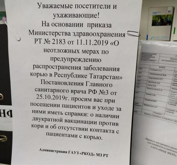 25 октября 2019 года вышло постановление Главного государственного санитарного врача по Республике Татарстан. На основании документа, подписанного Мариной Патяшиной, республиканский Минздрав издал приказ №2183, согласно которому пациенты на плановую госпитализацию, ухаживающие и посетители (до 55 лет включительно) допускаются в медицинскую организацию только при наличии сведений о вакцинации против кори (две прививки) или результатов серологического мониторинга на наличие защитных титров антител. Таким образом медики исключают возможность заноса в стационары кори гражданами, которые заболели, но сами об этом еще не знают.