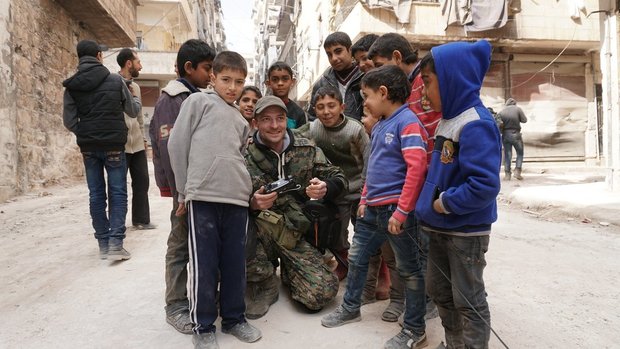 Много трогательных снимков. Видно, что люди сохранили добрые чувства, любовь к жизни, доброжелательность, любопытство, доверчивость, несмотря на войну. Сирийцы положительно реагировали на российских граждан. Фотографировались с удовольствием. У Кирилла есть фотографии — друзья его сняли. Дети, человек 10, обступили его со всех сторон, а он в центре, запускает коптер. И он улыбается открыто, озорно, и рядом дети — доверчиво, с любопытством. Обступили его. Кирилл рассказывал: «Дети потом бежали за коптером и кричали: «Самолет! Самолет!» Очень удачная фотография!