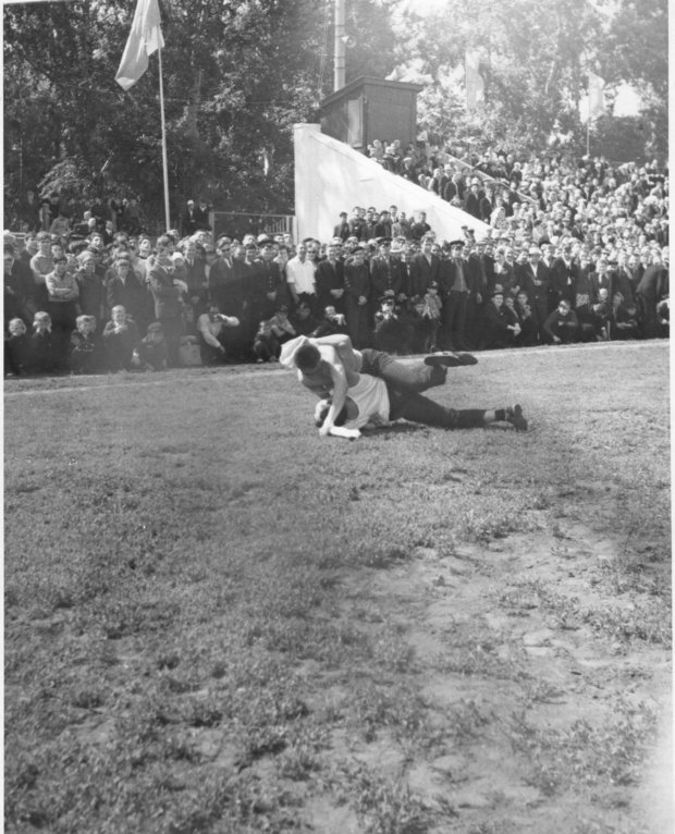 На стадионе не только играли в футбол. Тут были и эстафеты, и другие интересные старты, и даже мотоциклетные гонки. Проводились и соревнования по борьбе.