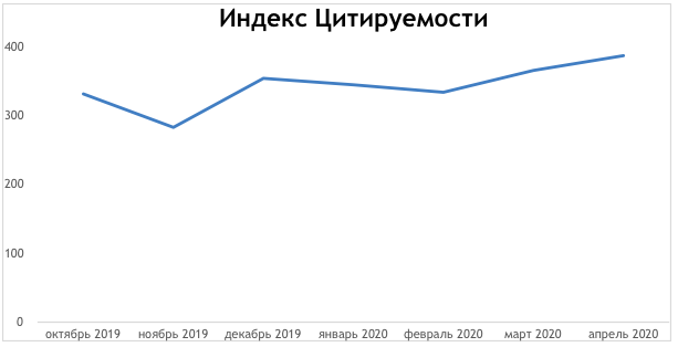 Так, в октябре прошлого года суммарный индекс составлял 330,9, в ноябре наметился спад до 282,35, после чего, в декабре, показатель резко вырос до 353,52. Январь (344,14) и февраль (333,3) характеризуются снижением индекса цитируемости, однако в марте 2020-го, когда в России был объявлен локдаун, наметился резкий рост показателя до 365,02. Апрель показал себя еще лучше для изданий — суммарный индекс цитируемости топовых татарстанских СМИ вырос до 386,45.