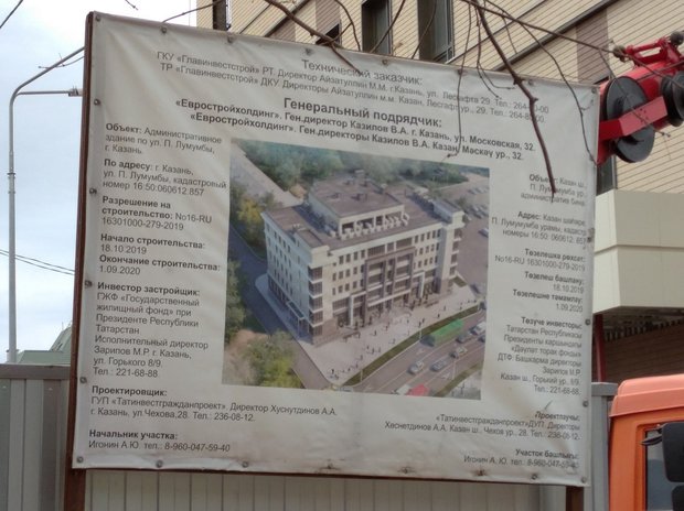 На баннере за оградой стройке ГЖФ указан в качестве инвестора-застройщика проекта. Техническим заказчиком выступило ГИСУ РТ, а генподрядчиком «Евростройхолдинг+». На счету этого «короля госзаказов» — реконструкция здания присутственных мест в Казанском кремле, нового казанского зоопарка, здания НКЦ «Казань». Также в активе стройфирмы — реставрация Казанского цирка, ремонт двух ведущих театров республики и строительство собора Казанской иконы Божией Матери.