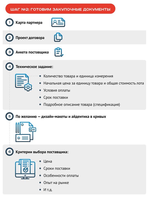 — Мы рекомендуем указать в закупке и критерии, по которым вы будете оценивать участников закупки. Поставщики должны понимать, исходя из чего вы будете делать выбор — это поможет им оценить свои силы и составить качественное предложение. В числе критериев выбора могут быть: цена, срок поставки, особенности оплаты, опыт работы поставщика и т. д. А если вы много лет работаете с одними и теми же типографиями и не хотите их обижать (но и переплачивать тоже не хотите) — укажите их в списке потенциальных поставщиков в специальной графе на ЭТП. Их пригласят поучаствовать в вашей закупке.