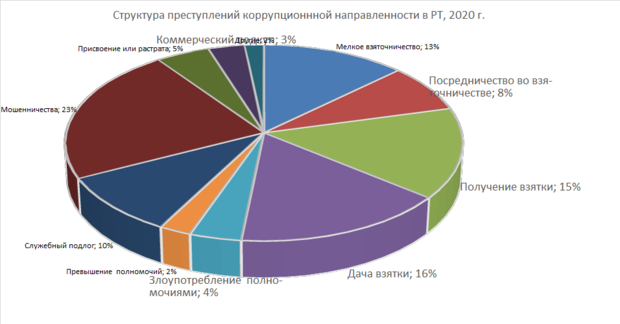 Преступления коррупционной направленности в Татарстан также резко выросли (+25,8%). Почти в 2,5 раза стало больше служебного подлога (в 2019 году — 31 ед., в 2020-м — 107).
