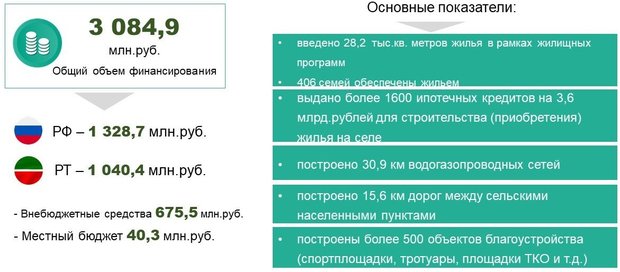 В 2020 году на реализацию госпрограммы «Комплексное развитие сельских территорий» было выделено чуть более 3 млрд рублей. 1,3 млрд из них поступили из федерального бюджета, 1 млрд рублей — из республиканского. Еще на 40 миллионов раскошелились местные бюджеты, и дополнительное финансирование в размере 675 млн рублей поступило из внебюджетных средств.
