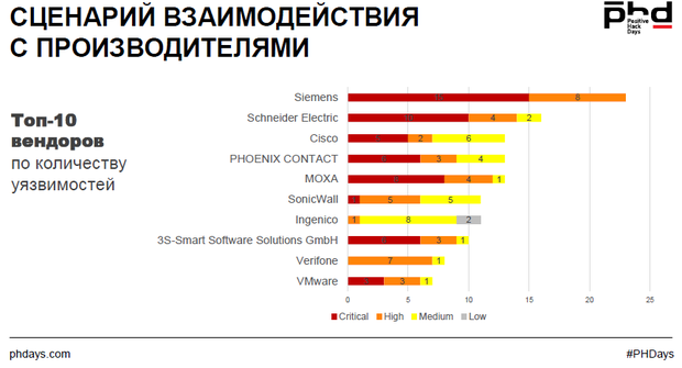 Топ-10 вендоров по количеству уязвимостей, согласно представленной статистике по большей части разрабатывают ПО в сфере промышленности. В грустном топе лидеров — Siemens, Schneider Electric и Cisco. По статистике, промышленные компании дольше всех закрывают уязвимости в своем ПО.