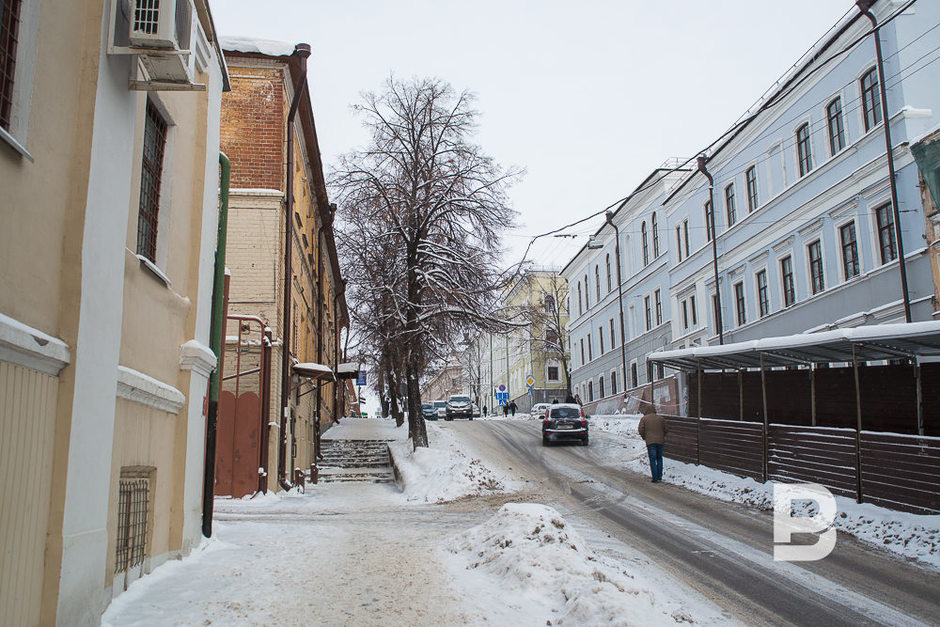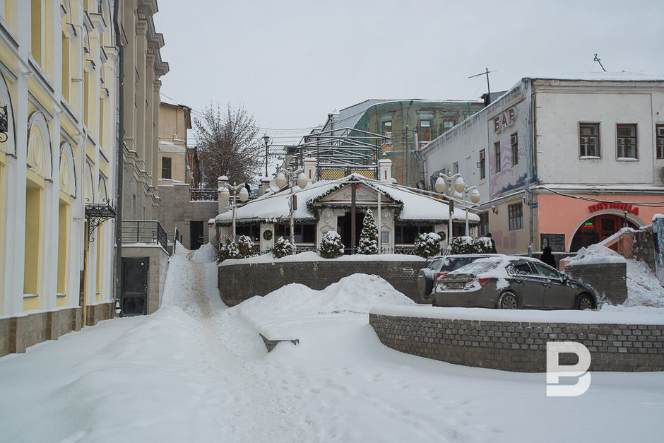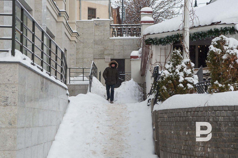 По многочисленным лестницам в столице Татарстана спускаться решительно опасно — снег превратил ранее безопасные спуски в сплошные горки.