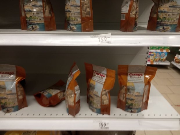 Здесь на полках валялись оставшиеся две-три пачки элитного тростникового сахара, который в два-три раза дороже обычного свекольного. И даже эти остатки забрали на глазах у корреспондента.