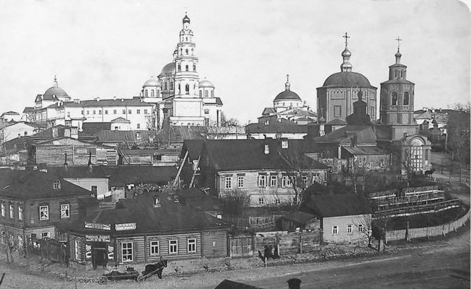 Напротив дома чиновника стоял монастырь Казанской Богородицы. По встречающей нас слева от входа Софийской надвратной церкви можно понять, где находилась Казанская улица — храм стоял на красной линии. Эта старейшая часть монастыря середины XVII века, к ней историки добавляют и колокольню. Все остальное, не считая новопостроенного собора, — XIX век.