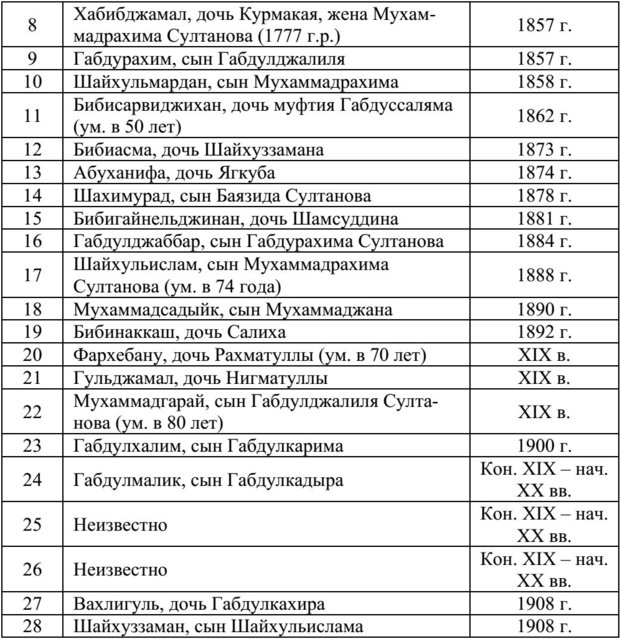 «1256 лето по арабскому исчислению и по румийскому [греческому] исчислению лето 1841. Созвездия водолея в 21 день [21 января] Шайхульислама амира дочь Бибигазизабану, покойная и прощенная, внучка полюса эпохи, муфтия [нынешнего] времени покойного Абдуссаляма, переселилась в обитель вечности в 4 года. От Адама, мир ему, 7349 [год]. От Нуха, мир ему, 5107 [год]»10.