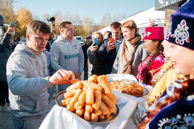Руслан Пименов отломил кусочек хлеба, посолил его и съел, как того требует обычай. Андрей Аршавин попробовал чак-чак. В самом манеже гостей встретили бурными овациями. Первым ребят поприветствовал чемпион мира по пляжному футболу Борис Никоноров: