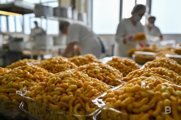 — Мы делаем много чак-чака, тонну-полторы в день, — рассказывает Булат Кутдусов. — И все это съедается. У нас вообще нет переходящих остатков и больших складов. Сейчас мы производим 65—66 тонн продукции в сутки, и практически вся она расходится. Переходящий остаток по всей продукции составляет не больше 500 килограммов. Все фреш — сделали и отгрузили.
