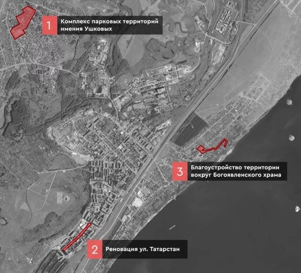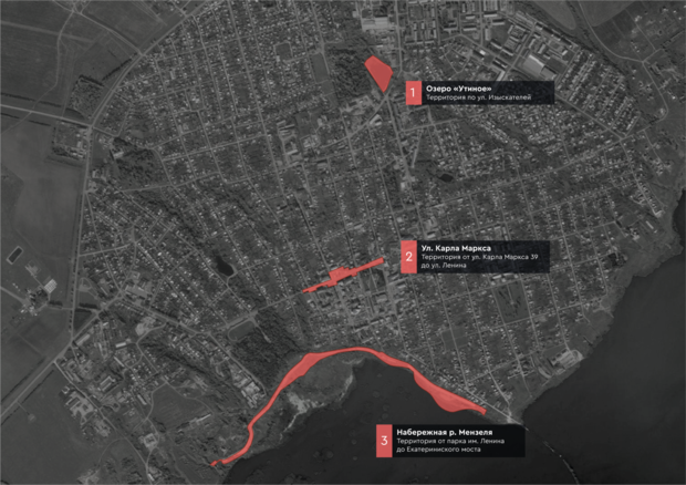 - набережная реки Мензеля (от парка им. Ленина до Екатерининского моста) — она соединит город с выходом к реке, также будут организованы безопасные пешеходные и велосипедные маршруты.