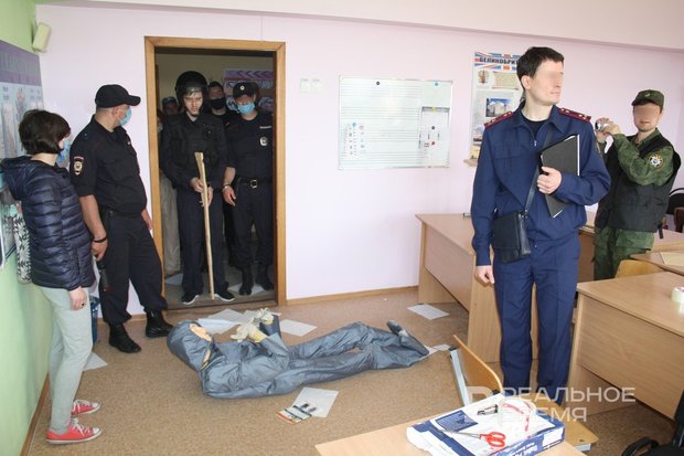 Роли жертв выполняли приглашенные статисты, в том числе — не участвующие в следственных действиях сотрудники центрального аппарата Следкома по РТ. Пол и возраст статистов в данном случае значения не имели — ставилась задача воссоздать последовательность действий нападавшего и реакцию детей и взрослых. В итоге роль первой из обстрелянных у входа в гимназию девушки в ходе данной процедуры исполнил мужчина-здоровяк. Галявиев называл эту потерпевшую школьницей лет 16 и говорил, что попасть в нее не смог — убежала.