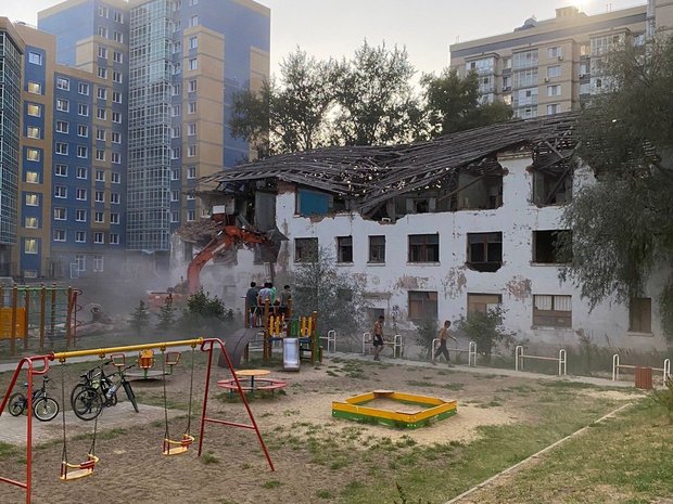 Рабочие сносят здание в опасной близости от детской площадки