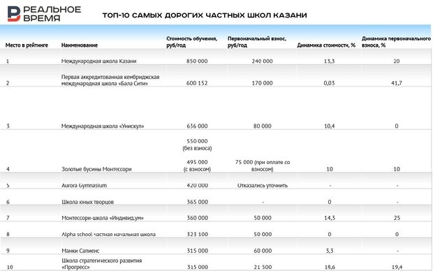 По официальным данным Управления образования Исполкома Казани, в частных школах города сегодня обучаются порядка 2 200 детей. Это всего лишь 1,3% всех школьников города. Во многом такая статистика объясняется тем, что образование в частной школе — недешевое удовольствие для родителей, и его стоимость продолжает расти. «Реальное время» изучило прайсы 18 частных школ столицы республики и составило топ-10 самых дорогих школ. На что стоит обратить внимание при выборе частной школы, какие документы стоить проверить и о каких скрытых платежах уточнить — в обзоре аналитической службы.