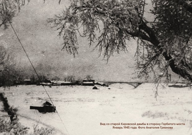 Вид на Горбатый мост был последним фото, сделанным с дамбы. Следующие снимки отец сделал уже в парке Петрова, когда вернулся домой. Его дорога в тот день проходила через Горбатый мост, ее можно проследить по карте. Он дошел до железнодорожного переезда в конце дамбы, повернул направо, на Переднюю улицу, еще один правый поворот, и вот впереди мост.