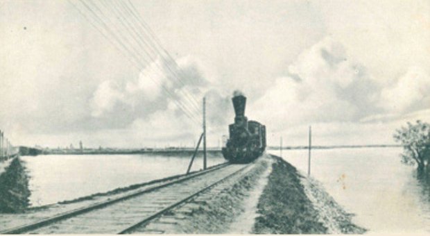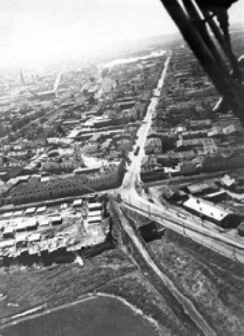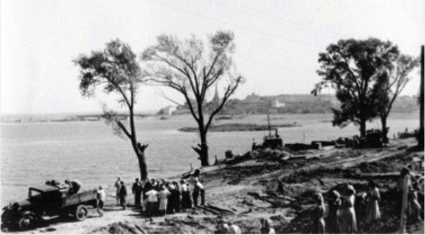 Вот какой могучей стала дамба спустя 60 лет! На снимке с самолета 1939 года виден перекресток улиц Успенской и Кремлевской, трамвай, многочисленные строения по обеим сторонам дамбы. Можно ориентировочно показать точку съемки титульного фото.