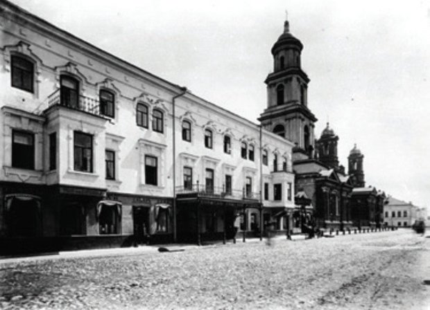 На фотографии 1930 года видно, как начинают разбирать Воскресенский собор, на его месте сейчас химический факультет университета. Этот храм был построен по проекту архитектора Генриха Розена в 1876—1890 гг. В то время улица Кремлевская носила название Воскресенская по имени этого собора.