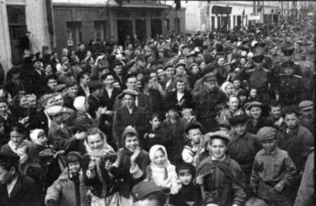 Тот же долгожданный день на другом конце города — в парке Петрова, на забытом на все долгие годы войны стадионе. Оказывается, этот день был пасмурным, а праздник был в душе у каждого.