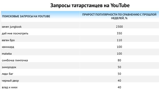 По принципу первой таблицы (ранжированы по приросту популярности или повышению интереса по отношению к прошлому периоду) приводится то, что в тренде у татарстанцев на YouTube: