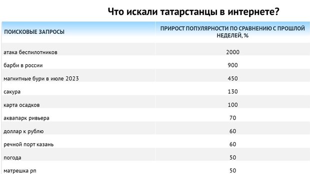 Главной темой прошедших семи дней для татарстанцев стали очередные атаки беспилотников ВСУ на Москву и Московскую область. Рабочая неделя с 24 по 28 июля началась с такого происшествия и закончилась на нем же — два дрона попали в нежилые здания, а еще один был сбит вне городской территории. Одновременно с этими ЧП жителей республики сильно волновала нашумевшая голливудская новинка — фильм «Барби». Кинокартина вышла в мировой прокат 21 июля, однако, как уверяют эксперты, в России сможет появиться не раньше осени. Еще одной интересующей темой стали внезапные магнитные бури, которые в этом месяце оказались наиболее активными и сильными. Что еще интересует татарстанцев и какие запросы в интернете оказались наиболее популярными — в обзоре аналитической службы «Реального времени».