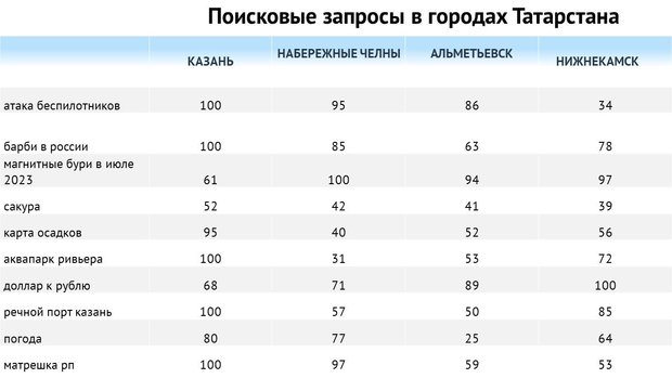 Первые два места топа — атака беспилотников и «Барби» — вызвали наибольший интерес у жителей столицы Татарстана. В остальных городах число запросов по этим двум громким новостям находилось примерно на одинаковом уровне. Исключением в ЧП с БПЛА стал Нижнекамск, в котором граждан это происшествие практически не интересовало. При этом в случае с голливудским фильмом нижнекамцы обошли жителей нефтяной столицы республики.