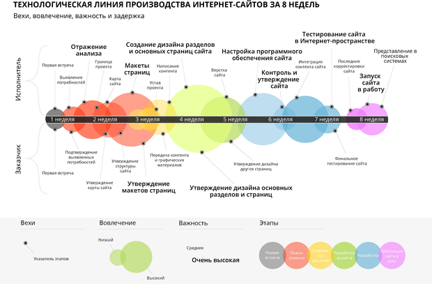 — На нижеприведенной схеме мы видим, что за 280 часов мы получаем продукт. И нетрудно рассчитать стоимость такого продукта, если знать стоимость нормо-часа специалистов. Вот пример производства и расчета трудозатрат на разработку «стандартного» корпоративного сайта с хорошим уровнем проработки.