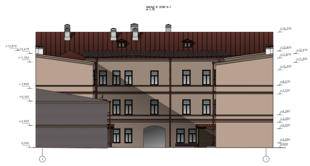 — Проектом приспособления предполагается размещение апартаментов и нежилых помещений с гибким функциональным назначением на первом этаже. Планировочные решения здания восстанавливают историческую планировку: первоначально на каждом этаже располагалось по две квартиры, в которые можно было попасть из парадных (справа и слева от центральной оси главного фасада). Парадные помещения данных квартир окнами выходят на ул. Горького и во двор. В здании предусмотрены две лестничные клетки, также винтовые лестницы в правом и левом крыле здания, ведущие из двухуровневых квартир в помещения мансарды, — указали эксперты Светлана Шаповалова, Игорь Нестеренко и Олег Свиридовский, изучившие проект реставрации дома в ходе государственной историко-культурной экспертизы.