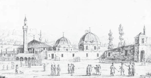 Правда, на плане У. Гесте 1798 г., которому надо доверять больше, на рисунке Тенилова 1803 г., а также на картине Жака-Кристофа Мивилля 1816—19 гг. мы видим крытую черепицей двухэтажную галерею на деревянных столбах. У маркиза Кастельно (до 1820 г.) здание описано так: «За кладбищем следуют служебные помещения и конюшни, над которыми надстроен еще один этаж-галерея. В конце всех этих сооружений расположен павильон с дверью, ведущей в третий восьмиугольный мавзолей».