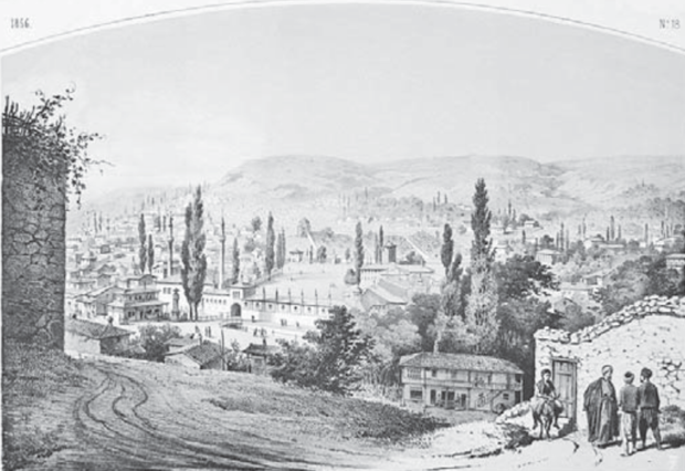 На гравюрах середины XIX в. ворота имеют небольшую одноэтажную пристройку с западной стороны. «Эта сторона (дворца, — И. 3.), — писал в 1863 г. Ф. Домбровский, — оканчивается довольно красивым теремом, одна сторона которого образует над воротами, составляющими противоположный выезд из дворца, род беседки, но только поменьше той, которая возвышается над главным въездом от речки Чурук-Су».