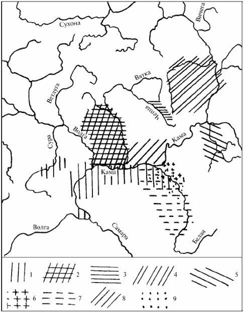 По материалам археологических исследований последних десятилетий в Среднем Поволжье в конце VII — IX в. выявлена довольно сложная, пестрая картина. До последнего времени изучение ранней истории булгар в Среднем Поволжье носило несколько однобокий характер, когда в центре внимания исследователей находились лишь крупные памятники, расположенные на территории Татарстана: Большетарханский, Тетюшский, Танкеевский, Большетиганский и др. На основе их изучения высказывались даже крайне странные мнения, что само переселение булгар в Среднее Поволжье произошло сравнительно поздно — в середине VIII в., а культура Волжской Булгарии складывалась при определяющем влиянии культуры угорского населения из Приуралья и Прикамья. Не будем умалять значения этих исследований, сыгравших важную роль в становление булгароведения, но сегодня они представляются явными анахронизмами.