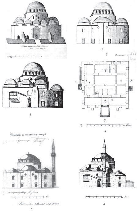 П.С. Паллас, посетивший Феодосию в 1794 г., когда мечеть еще не была перестроена, также оставил ее описание: «…большая, построенная с благородной простотой, прекрасная, еще порядочно сохранившаяся главная мечеть, называемая Биюк-Джами. Она имеет семнадцать саженей (36 м) в длину и четырнадцать (30 м) в ширину. Главный ее купол более девяти саженей в поперечнике (19 м), и с трех сторон она еще имеет одиннадцать маленьких куполов. Два минарета вышиной в шестнадцать саженей (34 м) с витой лестницей до самого верха еще существовали, когда я поручил нарисовать вид Кафы со стороны бухты, но затем они были разрушены. Около этой мечети находится большая турецкая баня с двумя сводчатыми помещениями». Судя по этому описанию, кроме большого центрального купола в здании было пять малых куполов, перекрывающих портик и по три купола над боковыми нефами. Но это явная ошибка, которая потом была повторена Дюбуа де Монпере, заставшего мечеть в полуразобранном состоянии, скорее всего, вообще без куполов. На чертеже В. Гесте (рис. 17), снявшего план здания в 1798 г., купола над боковыми нефами почему-то вообще не изображены. Однако, судя по плану, очевидно, что боковые нефы могут быть перекрыты только двумя куполами, следовательно, куполов (вместе с большим) всего одиннадцать, а малых десять. О десяти малых куполах пишет и П.И. Сумароков, который был в Феодосии в 1799 г.