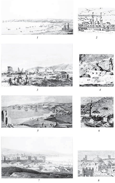 Также имеются многочисленные изображения панорамы Феодосии, на которых можно разглядеть мечеть султана Селима. Рисунки (и гравюры по ним) Г.Х. Гайслера 1794 г., М.М. Иванова 1803 г., Е.М. Корнеева 1804 г. и абсолютно идентичный последнему А. де Палдо 1805 г., изображают Феодосийскую бухту с севера (рис. 19. 1,3,5). На них отчетливо виден северный фасад Биюк-Джами с пятью куполами над входной галереей (рис. 19.2,4,6). Рисунок К.Ф. Кюгельхена 1824 г. показывает здание мечети с юго-восточной стороны, и на нем видны три купола над восточным фасадом, два из которых расположены над нефом, а один над галереей (рис. 19.7-8). Также имеются два рисунка интерьера мечети. А. Воронихин в 1786 г. изобразил южную стену мечети с михрабом и тремя ярусами окон (рис. 18.4). На зарисовке Н.А. Львова 1803 г. интерьер дан с восточной стороны (рис. 18.5). На нем отчетливо видны две стрельчатые арки, ведущие в западный неф, михраб в южной стене, мимбар рядом с михрабом и хоры у северной стены.