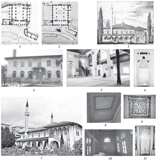 Центральная (кибловая) дверь ведет в узкое помещение входного тамбура. За ним находится квадратный в плане модельный зал, поделенный на нефы двумя рядами массивных квадратных в плане каменных колонн. На плане Бахчисарайского дворца, снятом в 1787 г. Джакомо Тромбаро (рис. 27.1), изображено четыре пары колонн, а на плане В. Гесте 1798 г. (рис. 27.2) три пары. Так как в десятилетие, прошедшее между этими событиями, ни о каких перестройках мечети неизвестно, остается предполагать, что Тромбаро ошибся. Колонны, по три с каждой стороны, поддерживают продольные аркады из пяти циркульных арок, на которые положены балки плоского перекрытия здания (рис. 27.5). В литературе встречается указание на то, что центральный неф мечети выше боковых, однако это неверно, потолок здания абсолютно ровный. Впечатление, что центральный неф выше, возникает из-за того, что вдоль северной, восточной и западной стен молельного зала сооружены деревянные хоры (мафиль), образующие как бы второй этаж. Балконы мафиля не доходят до кибловой стены на один арочный пролет, и поперечный неф перед михрабом имеет полную высоту. На мафиль можно подняться по двум каменным винтовым лестницам, расположенным у северной стены зала. По центру южной стены находится граненая ниша михраба с треугольным завершением, заполненным сталактитами в шесть рядов (рис. 27.6). Нишу обрамляет прямоугольная полоса, декорированная растительным орнаментом. Плоскость между рамой и конхой ниши также заполнена растительными побегами и цветами. По сторонам конхи расположены две цветочные розетки. Над ней плита с коранической надписью, по сторонам которой также аналогичные розетки. Справа от михраба у южной стены стоит высокий деревянный мимбер. Молельный зал освещается большими окнами в два света. На боковых стенах окна обычной прямоугольной формы, на южной стене окна второго яруса фигурные, с цветными стеклами. Над михрабом сделано круглое окно с витражной вставкой в виде шестиконечной звезды. Из молельного зала имеется еще один выход, расположенный в северной части западной стены и ведущий непосредственно во двор.