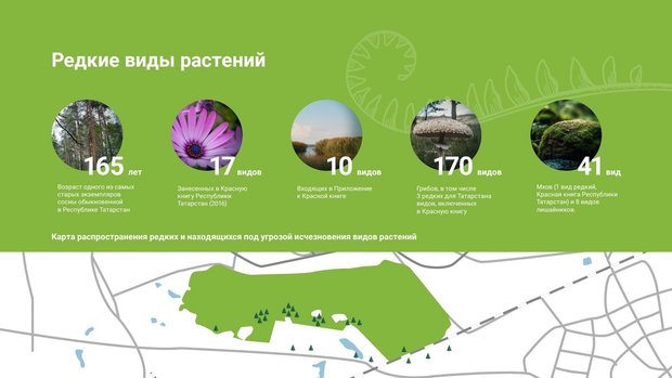 Как выяснили ученые, на обследованном участке лесопарка, находящегося в северной части Казани и примыкающего к санитарно-защитной зоне крупного промышленного предприятия, обитает большое количество редких видов растений и животных. Так, на небольшом участке леса произрастают и проживают четверть видового разнообразия флоры и фауны республики: 383 вида растений (в том числе 17 внесенных в Красную книгу РТ и еще 10 входящих в приложение к Красной книге), 210 видов птиц (из которых 43 вида — краснокнижные), 37 видов млекопитающих и пять видов рукокрылых (почти все редкие), 170 видов грибов (три внесены в Красную книгу РТ), 41 вид мхов и восемь видов лишайников.