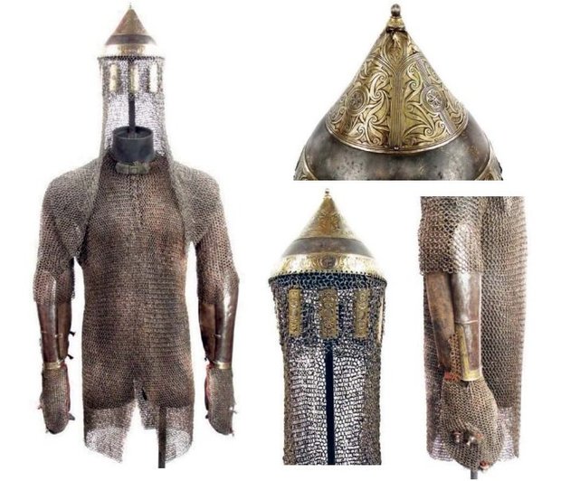 Музейные коллекции также дают представления о комплексе доспехов крымских ханов для XVIII в. Так, известен доспех хана Сахиба Герая II, проданный на аукционе в Мериленде (США). К сожалению, без возможности визуального осмотра предметов их сложно идентифицировать. Из описания на сайте аукциона можно предположить, что он принадлежал хану Сахибу Гераю II, а на одном из предметов надпись, что владельцем был Каплан Герай. Доспех состоит из шлема с кольчужной бармицей, кольчуги, пластинчатых наручей с прикрепленной к ним кольчужной защитой тыльной стороны кистей. Шлем вытянут из цельной стальной пластины, верхняя часть выполнена в виде конуса. На конус в верхней части и по низу прикреплены пластины, украшенные растительным орнаментом. Нижняя пластина опоясывает весь шлем, и на ней равномерно по всей окружности закреплены четыре серебряных медальона с надписями арабским шрифтом. На одном из медальонов и читается имя Сахиба Герая. К конусу прикреплена кольчужная бармица со вставками из десяти прямоугольных железных пластин, покрытых позолоченными серебряными пластинами с гравировкой и чеканным орнаментом в виде многолепестковых розеток. Коническое навершие шлема переходит в шаровидное утолщение, вероятно, с отверстием. Кольчуга на вороте спереди снабжена посеребренной пластиной, украшенной гравированным орнаментом и выполняющей функцию застежки. Наручи, вероятно, представляют собой конструкцию из стальных пластин, закрывающих предплечье от кисти до локтя с внешней стороны, и кожаных манжетов с внутренней стороны. Металлическая часть по внешнему и нижнему краю украшена, вероятно, серебряной пластиной с гравированным орнаментом. Кольчужная защита кистей крепится к тканому основанию стальными профилированными бляшками, образующими некое подобие шипов на тыльной стороне кисти. Доспех, по справедливому предположению И.В. Зайцева, мог быть собран из нескольких комплектов, которые, судя по надписям, принадлежали Сахибу Гераю II и Каплану Гераю, и может быть датирован 60—70 гг. XVIII в.