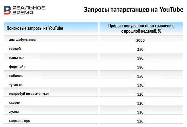 По принципу первой таблицы (ранжированы по приросту популярности или повышению интереса по отношению к прошлому периоду) расположены татарстанские тренды на YouTube: