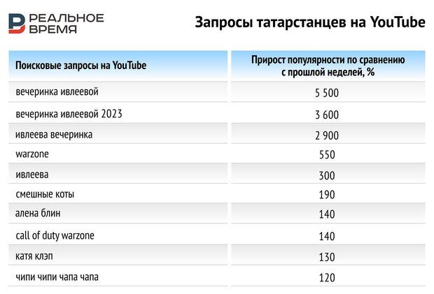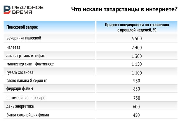 Анализировались запросы поискового сервиса Google в Татарстане за последние 7 дней. В таблице ниже приведены самые популярные трендовые запросы по веб-поиску, которые ранжированы по приросту популярности или повышению интереса по отношению к прошлому периоду (предыдущие 7 дней).
