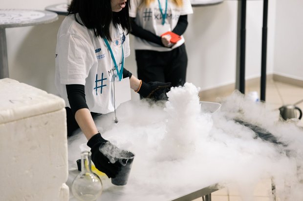 — У нас сегодня матч проходит под эгидой «Между нами химия». Мы вместе со зрителями проводим различные эксперименты. Я подробно объясняю и показываю болельщикам, что такое сухой лед. Это замороженный углекислый газ, имеющий температуру -79 градусов и обладающий интересными свойствами. Так, например, при погружении в теплую воду он начинает быстро переходить в газообразное состояние. А еще можно добавлять сухой лед внутрь мыльного раствора — получается настоящая мыльная каша, которая еще и горит, — рассказала организатор химического шоу Аделя Кабанова.