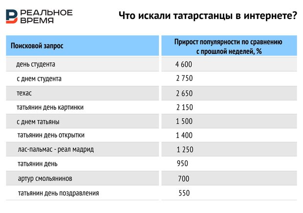 Главной темой прошедших семи дней для жителей Татарстана стал Татьянин день, или, как его еще называют, Татьянин день. Помимо праздника граждан волновали события, происходящие в американском штате Техас, где миграционный кризис чуть не развязал настоящую гражданскую войну. Также люди активно интересовались новым интервью актера Артура Смольянинова*, в котором он в очередной раз высказался против России. Что еще интересовало татарстанцев в интернете и какие запросы оказались наиболее популярными — в обзоре аналитической службы «Реального времени».