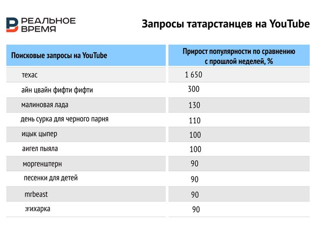 По принципу первой таблицы (ранжированы по приросту популярности или повышению интереса по отношению к прошлому периоду) расположены татарстанские тренды на YouTube: