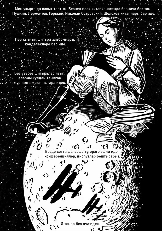 — Меня вдохновило темное звездное небо, которое очень часто присутствует в моих иллюстрациях. Дело в том, что когда работала над комиксом, мне по сердцу пришлось то пространство, в котором они совершали свои героические полеты. Ночь не холодная и страшная, а красивая. И вот этот лиричный лейтмотив горящих звезд проходит в течение всего моего комикса. Да, это героические личности, но они оставались женщинами. Они мечтали, фантазировали, к примеру, я узнала, что Магуба вышивала. И женщины, которые были вместе с ней в одном полку, тоже тянулись к прекрасному, собирали свою библиотеку. Что-то мягкое и женственное всегда оставалось с ними. Я попыталась передать это через красивое захватывающе темное небо.
