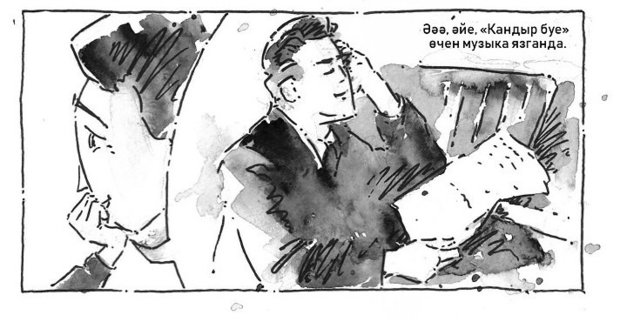 — Для меня самой занимательной оказалась история Сары Садыковой, — говорит Кашапов. — В книге Гульшат Зайнашевой я нашел рассказ, что в 1948 году Садыкову уволили из оперного театра, тогда она уже была успешной певицей, исполняла партии в именитых операх, например в первой опере «Сания». В то время ее знали именно как певицу, она тогда еще не писала песен, не занималась композиторством. За несколько лет ей пришлось переосмыслить свою жизнь. Наша история заканчивается тем, что режиссер Кашифа Тумашева дает ей заказ для нового спектакля. Я пытался искать сюжеты, которые близки читателю. Не сдаваться, пробовать что-то новое, не падать духом, принимать смелые решения. Мне кажется, об этом наши комиксы.