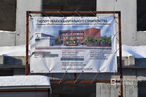 Если приглядеться, под скотчем можно прочесть фамилию застройщика — Рустамханов З.Р. Именно с этим индивидуальным предпринимателем сейчас судится Казанский исполком, требуя признать его действия по строительству объекта незаконными, поскольку не выдавал разрешение. Здание возводится на перекрестке улиц Гладилова и Табейкина, прямо перед прокуратурой Кировского района. Территория долгое время была заброшенной, здесь стояли аварийные полуразрушенные строения.