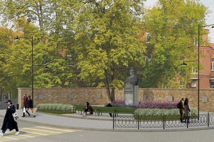 Как стало известно в феврале, у памятника Александру Вишневскому в этом году появится сквер — со скамейками, клумбой и освещением. Мы как раз дошли до этого места в наших прогулках по Бутлерова, прежде чем перейти к обзору медицинского городка, расскажем о трех объектах — Казани советской, дореволюционной и капиталистической.