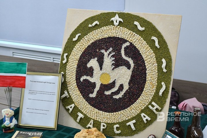 Студентка Альметьевского профессионального колледжа Диляра Шарипова изготовила государственный герб Татарстана из круп, бобовых и соленого теста. Материалы выбраны не просто так: манную крупу девушка использовала при подготовке фона, чтобы придать работе объем, кукурузную — для создания контраста. А маш и белые и красные бобы передают цвета татарстанского герба.