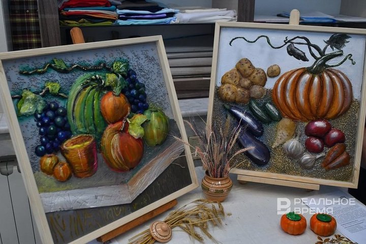 Объемные интерьерные картины создали для выставки учащиеся с ограниченными возможностями здоровья Казанского строительного колледжа. Их руководитель, мастер производственного обучения Елена Сафарова, презентовала декоративные гипсовые рельефы «Фрукты» и «Овощи».