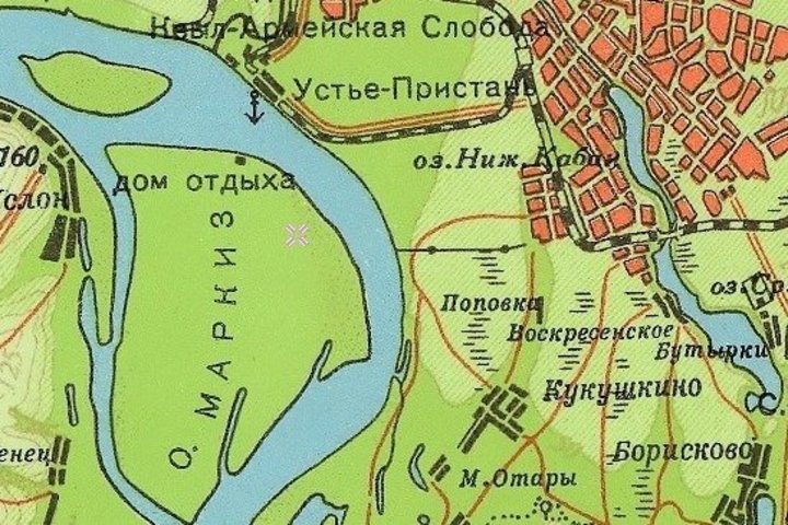 На приведенной карте видно, что остров Таҗи имеет большие размеры. Название острова поменялось в 1767 году. Царица Екатерина II, посетившая Казань, подарила этот остров итальянскому маркизу Палуччи. В 1911 году остров перекупил торговец Мусин. А местному населению понравилось слово «маркиз», и это красивое название сохранилось по сей день.